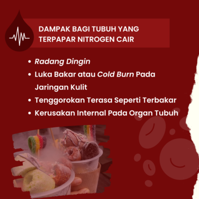 Selain itu, nitrogen cair ini juga berisiko menhebabkan luka bakar pada kulit dan jaringan dibawahnya akibat paparan suhu yang sangat dingin. Konsumen juga bisa mengalami sesak napas apabila menghirup secara menerus asap yang dihasilkan. (mia/jpg/k
