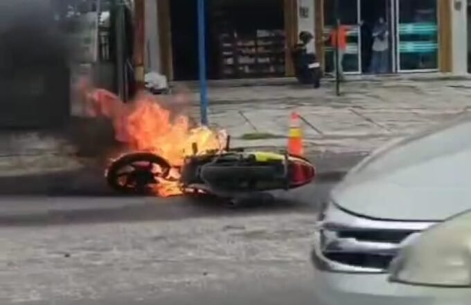 Saksi mata di lokasi mengatakan, motor tersebut terlihat oleng saat berbalik arah. Kondisi jalan yang licin akibat hujan menjadi penyebab motor terpeleset. Namun, yang tak disangka, dari bagian bawah motor tiba-tiba muncul percikan api dan langsung menjalar cepat hingga membakar seluruh bagian kendaraan. Dalam hitungan detik, si jago merah melalap bodi motor dan nyaris membahayakan pengendara.