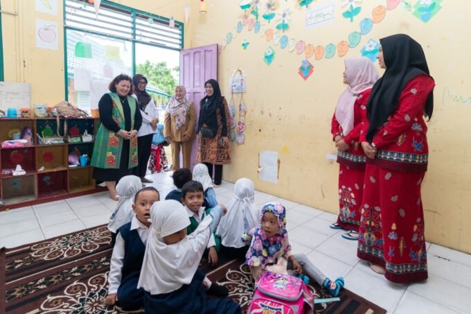 Ketua 1 Dharma Wanita Persatuan Pusat Bidang Pendidikan saat berkunjung ke TK Bakuwu dan TK Shalahuddin pada Senin, 4 Agustus 2025.