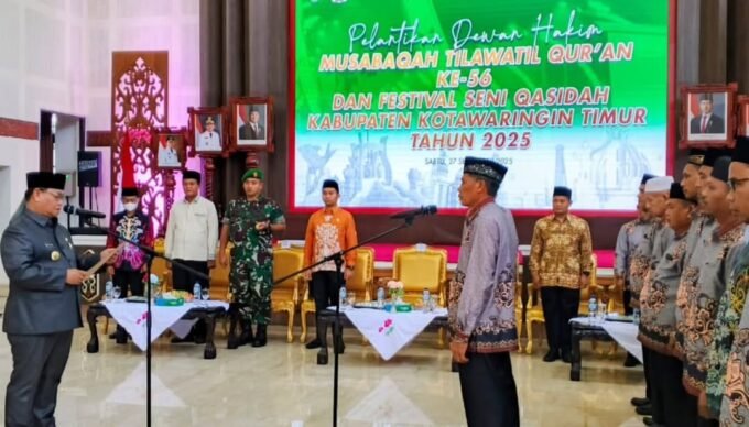 Pelantikan tersebut berdasarkan Surat Keputusan Bupati Kotim Nomor 188.45/0283/HUK-Kesra/2025 yang menetapkan susunan kepanitiaan MTQ ke-56 dan FSQ 2025. Struktur itu mencakup 3 pengawas dewan hakim, 2 koordinator, 8 majelis hakim dan juri, 31 hakim, serta 12 panitera.
