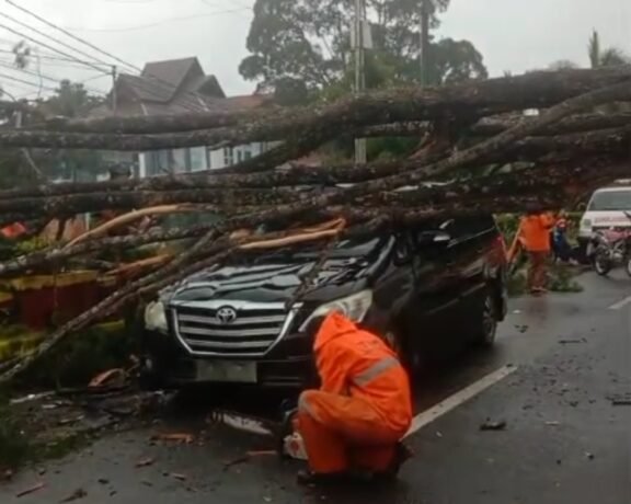 Pangkalan Bun – Hujan deras yang disertai angin kencang melanda Kota Pangkalan Bun, Kabupaten Kotawaringin Barat (Kobar), Sabtu (10/1/2026), dan menyebabkan sebuah pohon besar tumbang di Jalan Sutan Syahrir. Pohon tersebut menimpa dua kendaraan, yakni sebuah mobil ambulans dan mobil Toyota Innova berwarna hitam.
