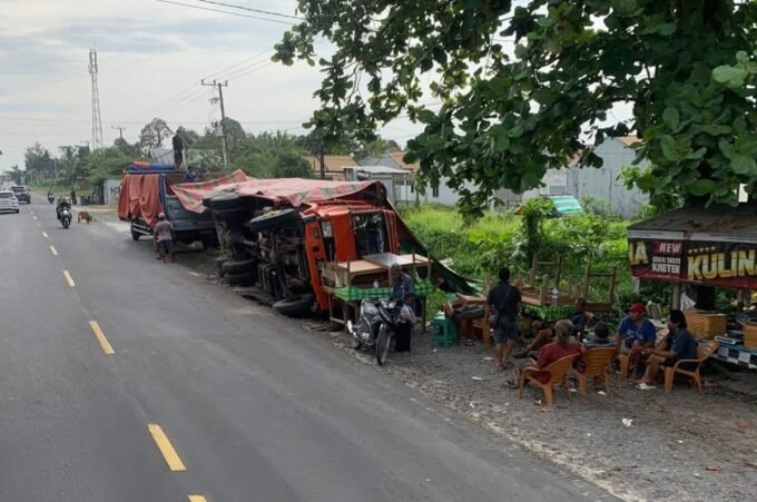Pangkalan Bun, kaltengonline.com – Kecelakaan tunggal kembali terjadi di wilayah Kecamatan Kumai, Kabupaten Kotawaringin Barat. Sebuah truk jenis Mitsubishi Fusso yang mengangkut bongkel kelapa sawit terguling di Jalan Utama Pasir Panjang, Desa Batu Belaman, Jumat (6/3/2026) sekitar pukul 11.00 WIB.