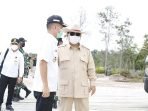 KUALA KURUN – Bupati Gunung Mas (Gumas) Jaya S Monong bersama Forum Koordinasi Pimpinan Daerah (Forkopimda) menyambut kedatangan Menteri Pertahanan (Menhan) RI